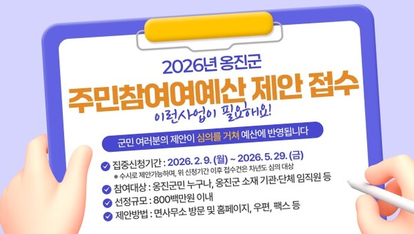 옹진군은 2027년 예산 편성을 앞두고 2026년 주민참여예산 사업 공모를 오는 5월 29일까지 실시한다고 밝혔다.