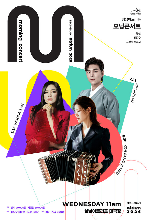 성남아트리움은 올해 새로운 낮 공연 기획 시리즈 ‘모닝 콘서트’를 신설하고, 5·7·9월 수요일 오전 11시, 재즈와 국악, 탱고 등 장르별 국내 대표 아티스트의 무대를 선보인다.