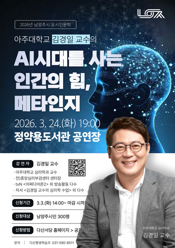남양주시는 오는 3월 24일 정약용도서관에서 김경일 아주대학교 심리학과 교수를 초청해 ‘2026년 도시인문학 특강’을 개최한다고 26일 밝혔다.
