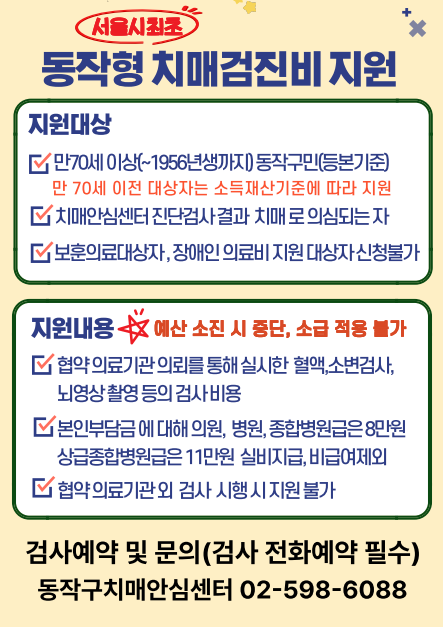 만 70세 이전 대상자(소득재산기준 제한 있음), 협약 의료기관 등 기타 자세한 사항은 동작구치매 안심센터(02-598-6088)로 문의하면 된다.