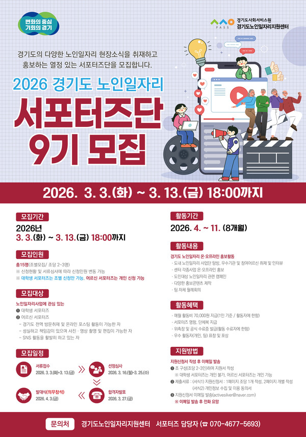 경기도사회서비스원 노인일자리지원센터는 3월 13일까지 경기도 노인일자리 홍보를 위한 ‘2026년 경기도 노인일자리 서포터즈단 9기’ 단원을 모집한다.
