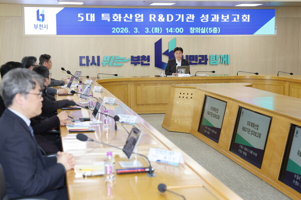 부천시는 지난 3일 시청 창의실에서 금형·조명·로봇·패키징·세라믹 등 5대 특화산업 분야 연구개발(R&D) 기관 대표들과 함께 ‘2026년 5대 특화산업 R&D기관 성과보고회’를 열었다.