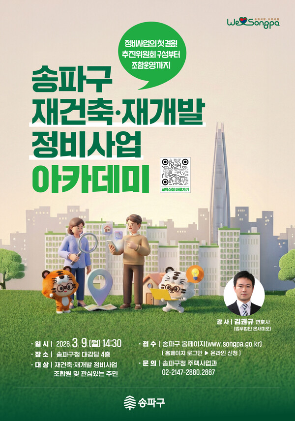 송파구는 오는 9일 구청 대강당에서 '제1회 송파구 재건축·재개발 정비사업 아카데미'를 연다. 올해는 조합원뿐 아니라 일반 주민까지 대상을 확대했다. 정비사업에 관심 있는 주민과 추진위원회·조합 임원 등 400명을 대상으로 하며, 신청은 8일까지 구 홈페이지에서 선착순 접수한다.